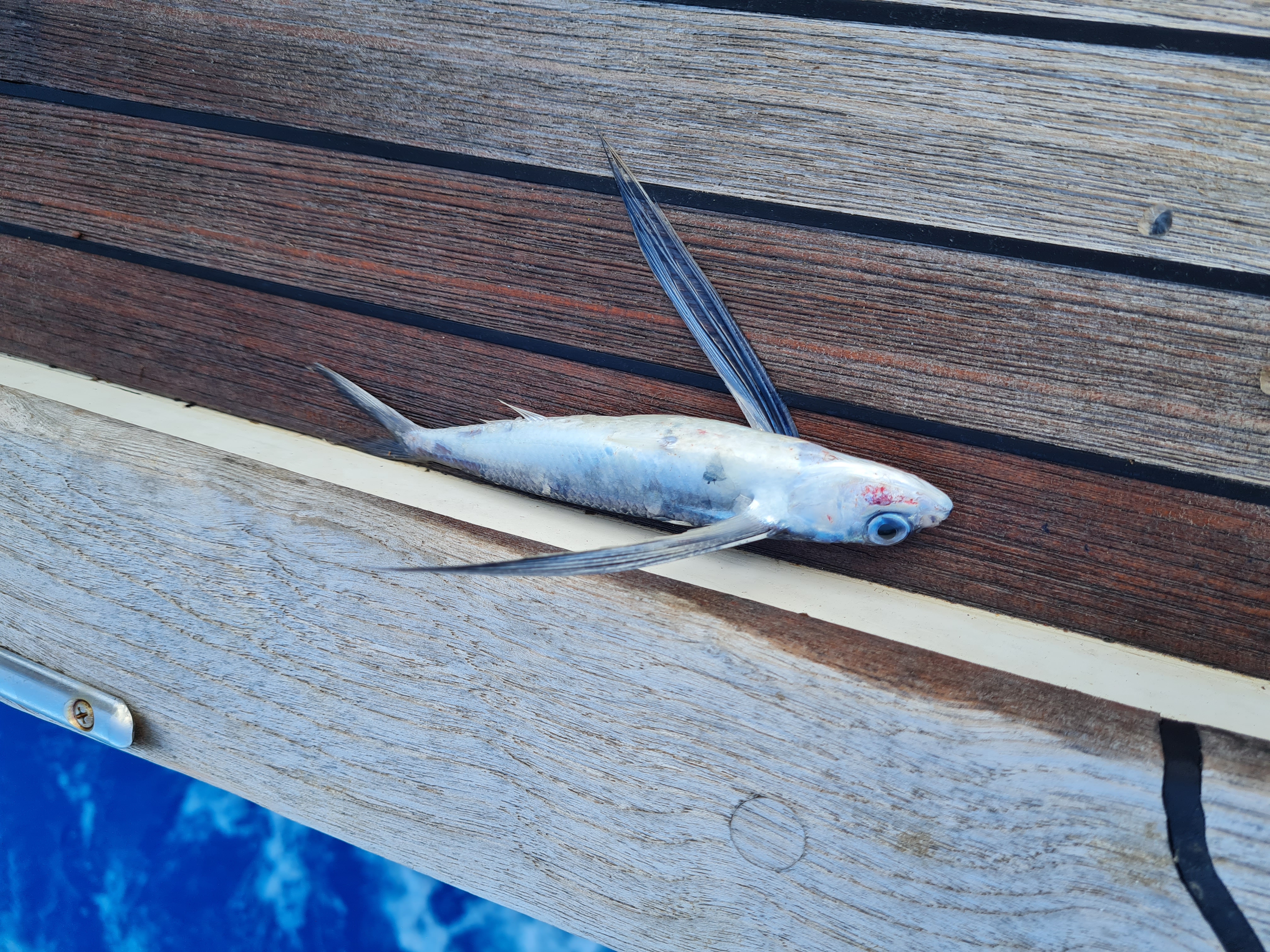 Etwa auf halber Strecke verabschiedete sich dann unsere Genua (Genuafall hat sich um Spiefall getwistet und so konnte sich die Genuafurlex nicht mehr drehen). Also blieb nur noch das Großsegel und das eiserne Segel (aka Motor). Wenigstens blieb das Meer gnädig. Moderate Wellen, meist sonnig. Jeden Tag tauchten Delfine oder Wale auf, und immer öfter schwirrten fliegende Fische über die Wellen – kleine Glitzerwesen, die übers Meer gleiten. Zwei davon landeten leider an Deck – und fanden dort ihr letztes Abenteuer.