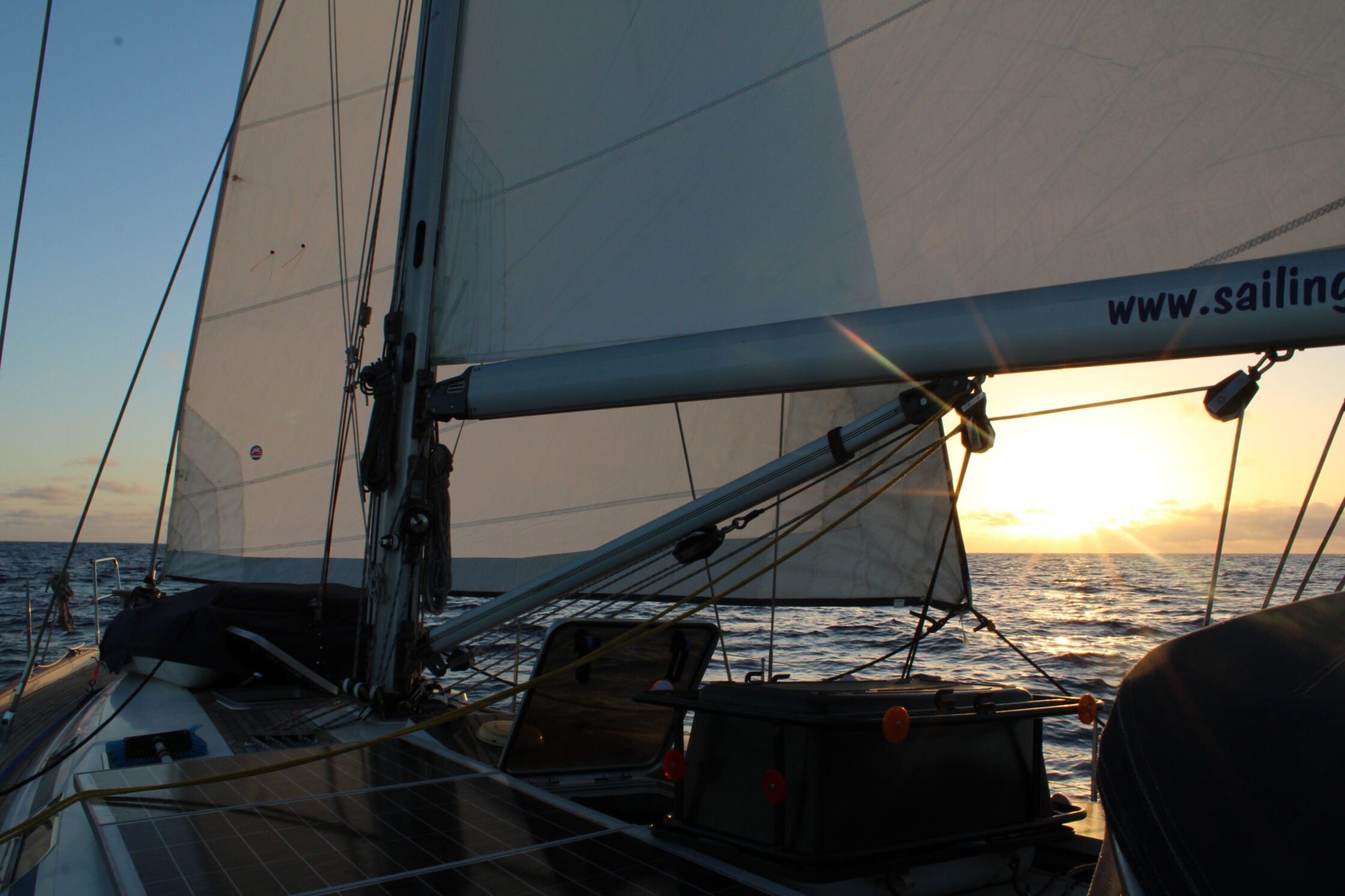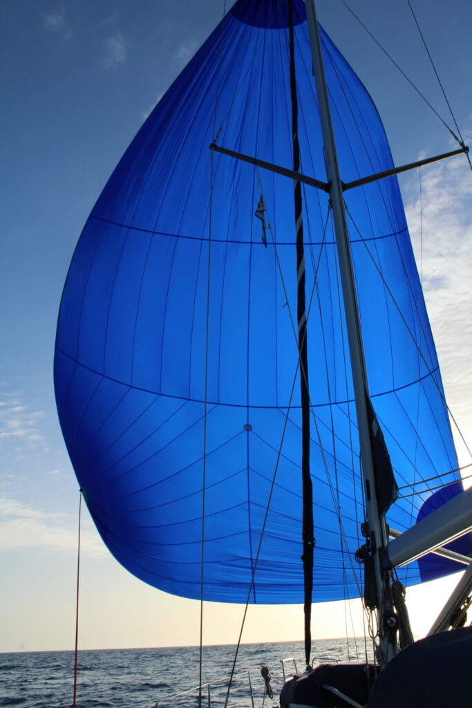 Wie so oft auf dieser Reise: Der Wind hatte wieder mal seinen eigenen Kopf. Tagsüber schlief er fast ein, nachts drehte er auf. So wechselten wir regelmäßig zwischen „Segeln im Schmetterling“, „normalem Kurs“ und dem Spinnaker – schließlich soll’s ja nicht langweilig werden.